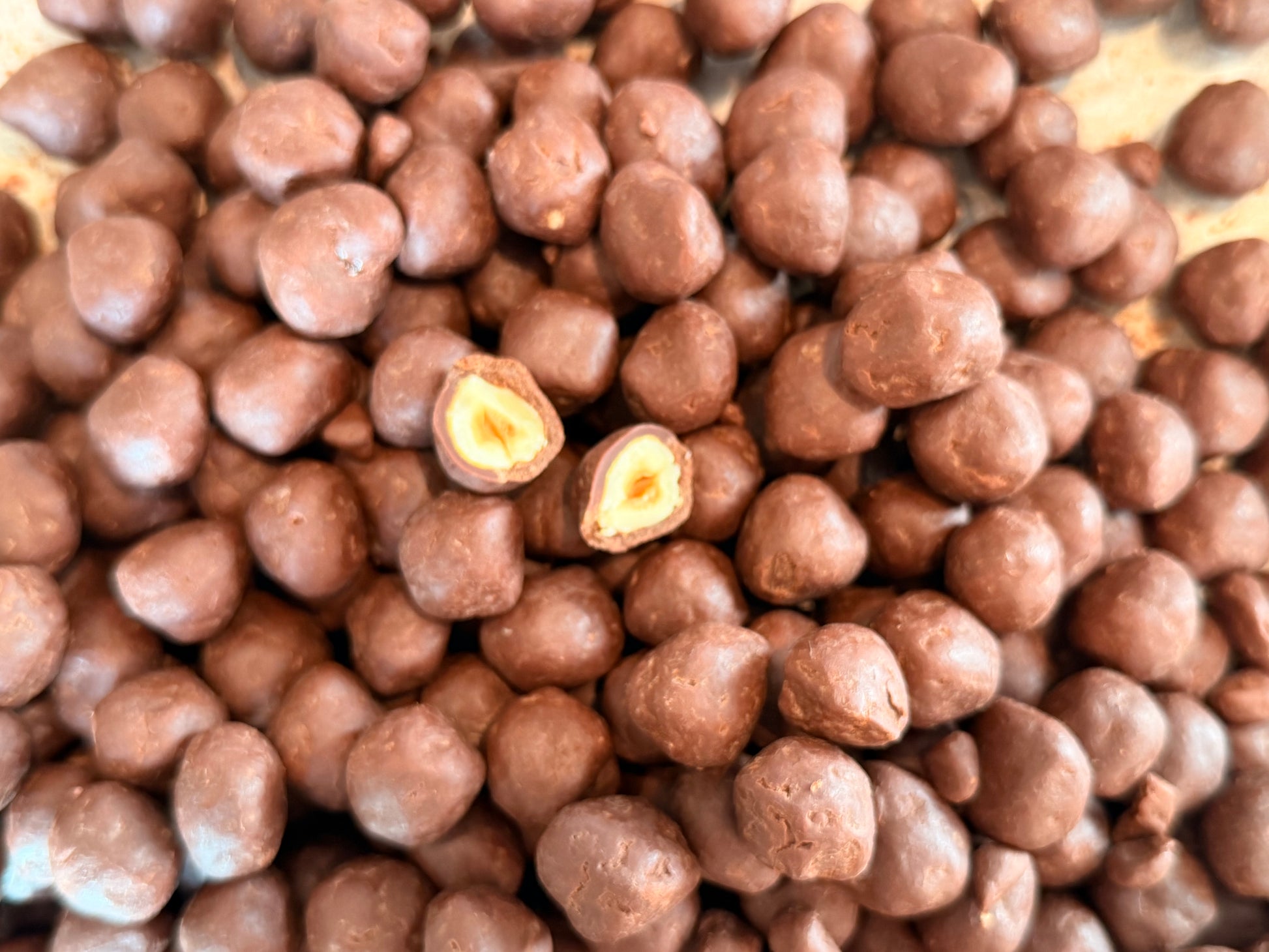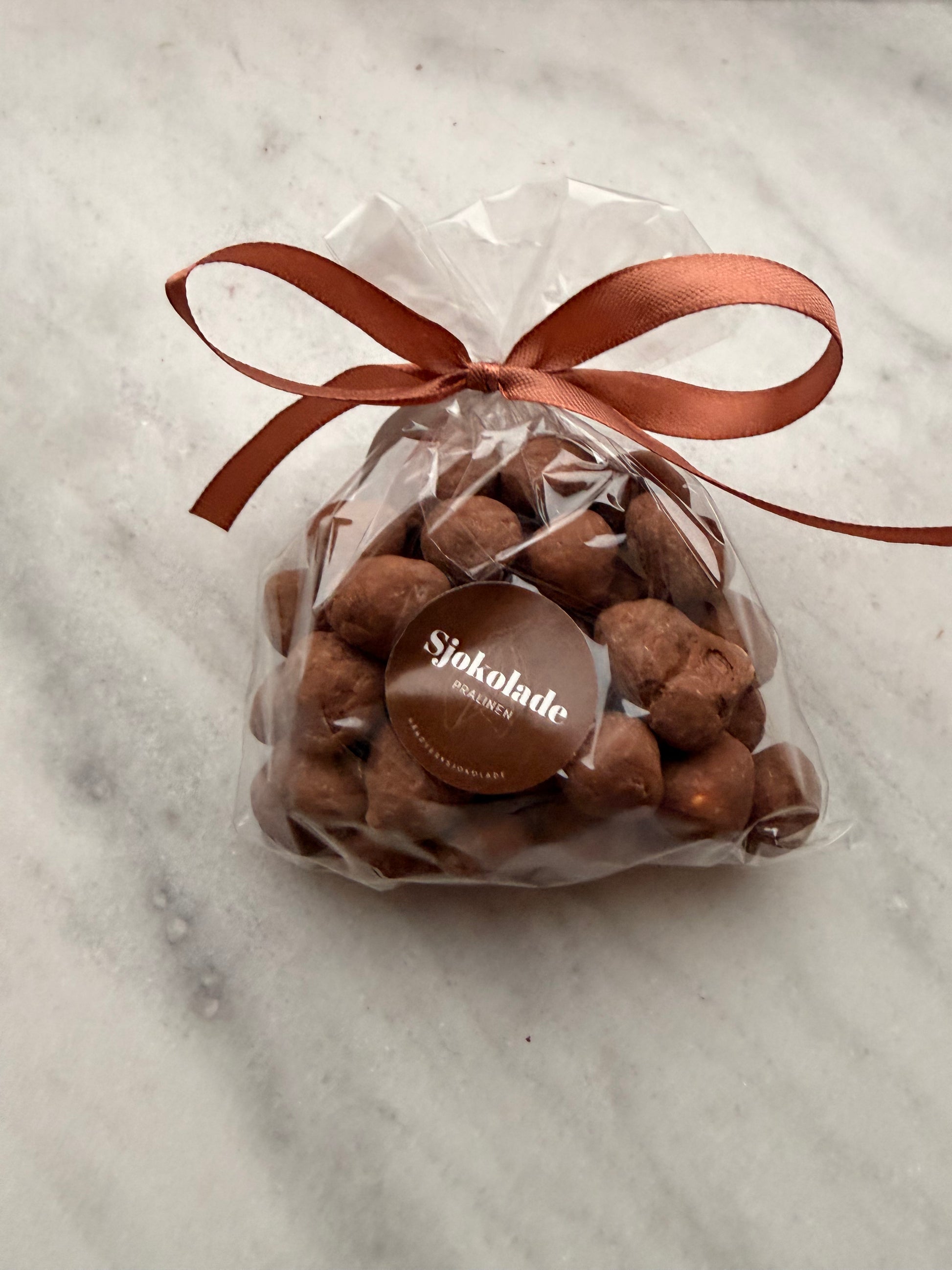 Sprø, karamelliserte hasselnøtter vendt i kanel, kardemomme og et hint av havsalt – dobbelttrukket i fyldig Valrhona Jivara 40 % melkesjokolade.