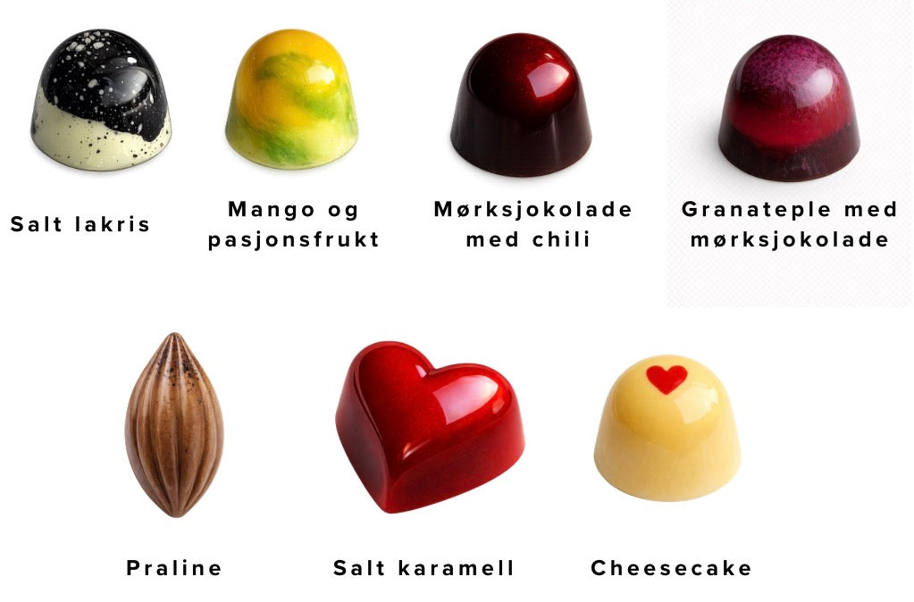 Hver pralin er laget for hånd med fokus på kvalitet, råvarer og detaljer. Esken rommer en harmonisk blanding av fruktige, søte og intense smaker: