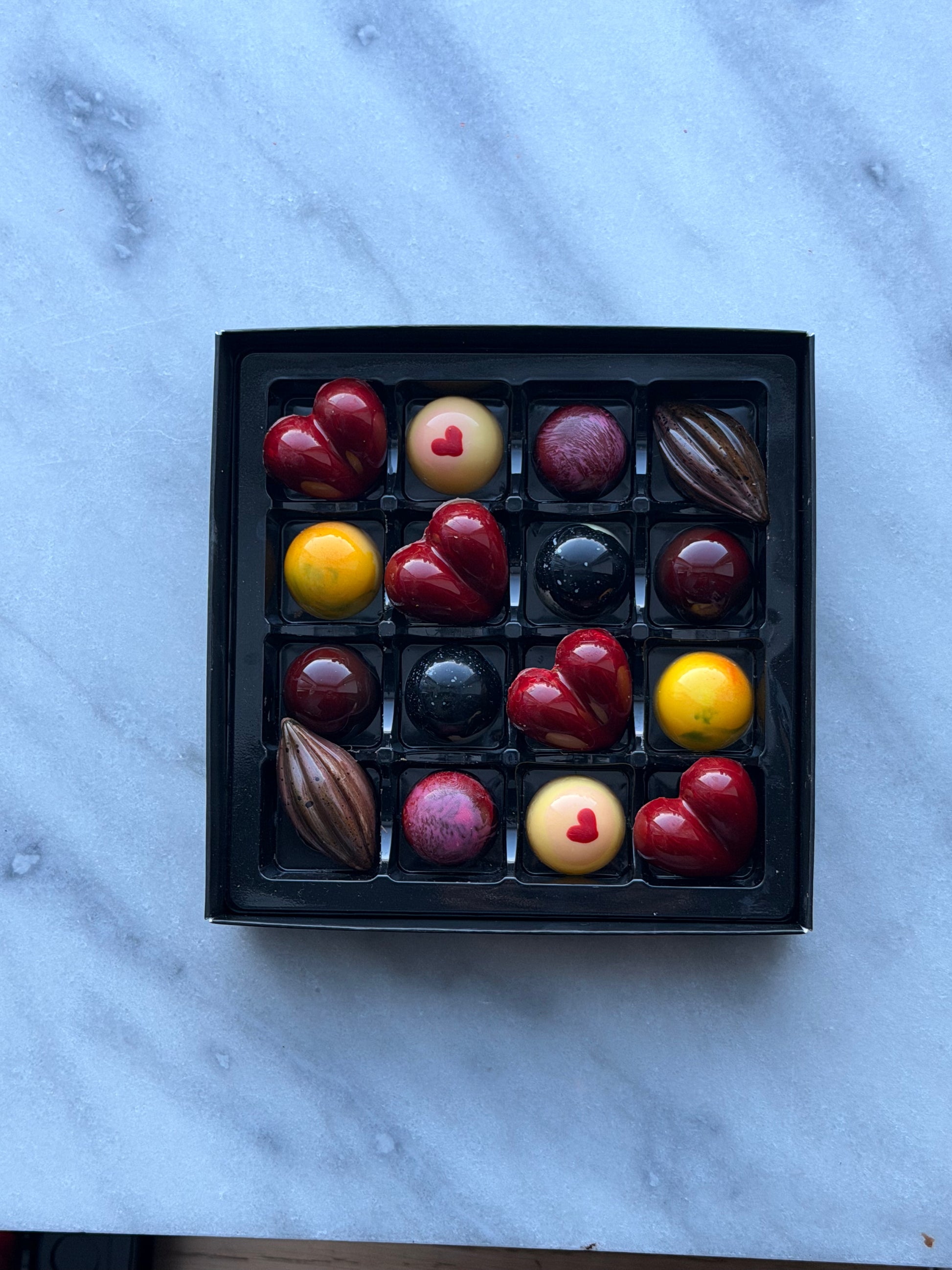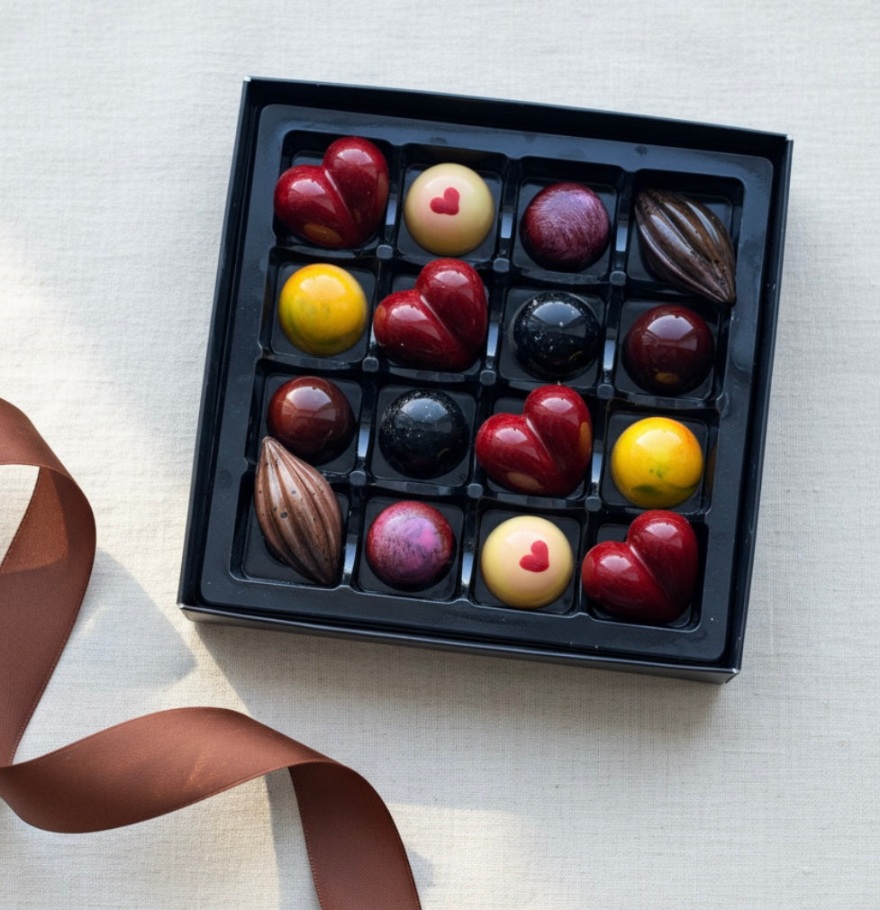 En kjærlighetsfull gave fylt med håndlaget konfekt, skapt for å glede både hjerte og smaksløker. Denne eksklusive 16-bit esken byr på et nøye kuratert utvalg av praliner med balanserte smaker, elegante former og kunstnerisk finish – perfekt til Valentinsdag og morsdag.