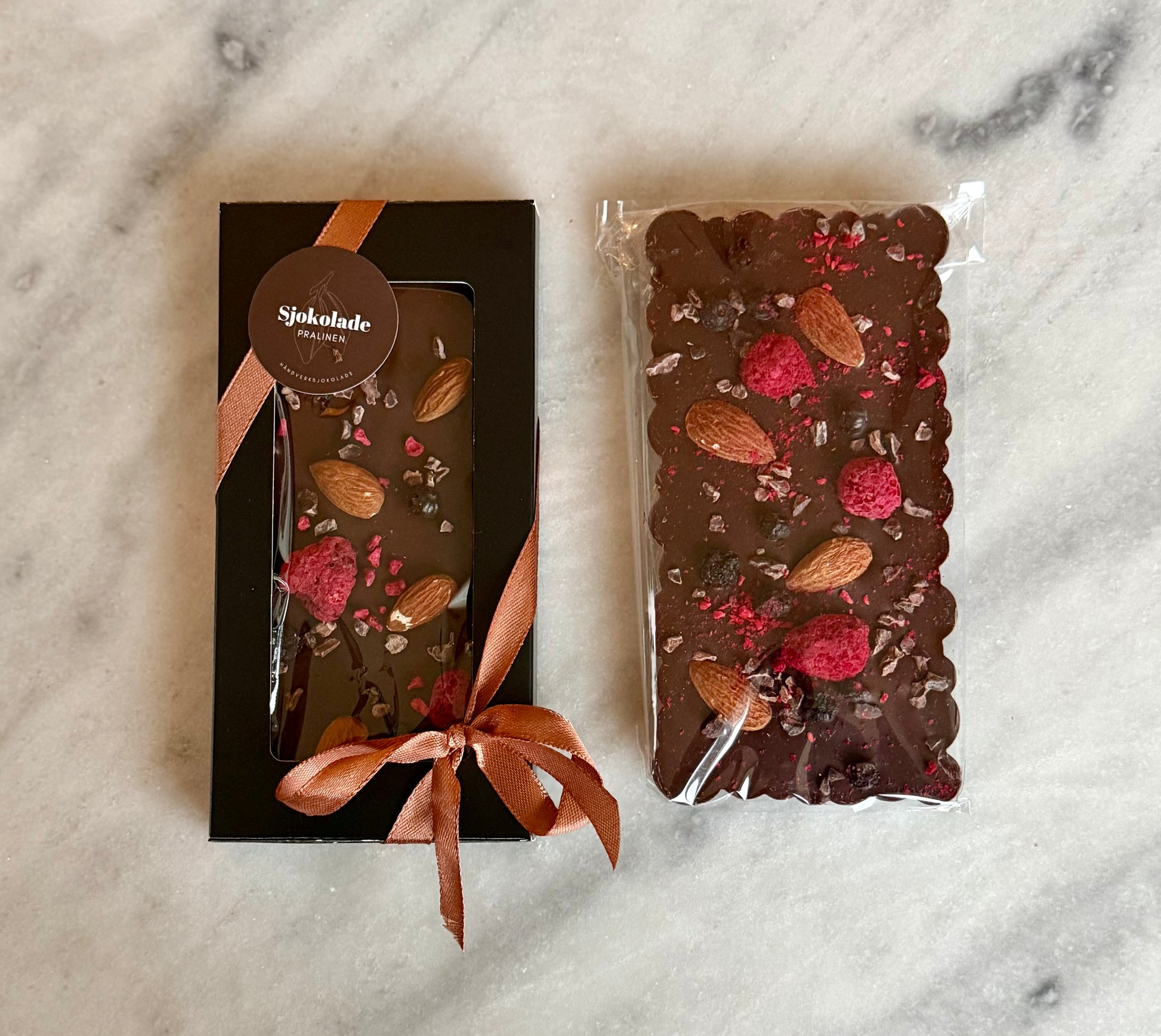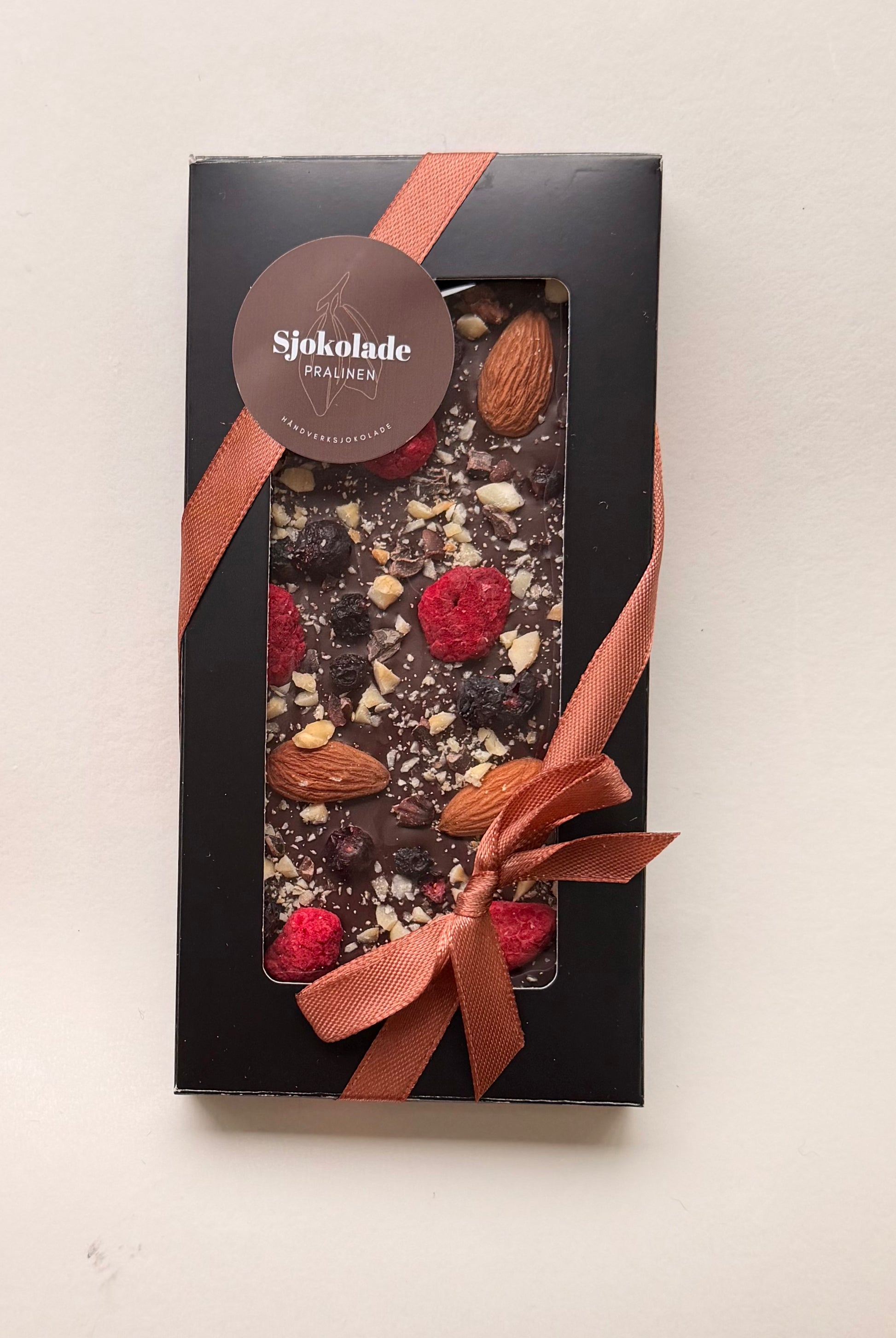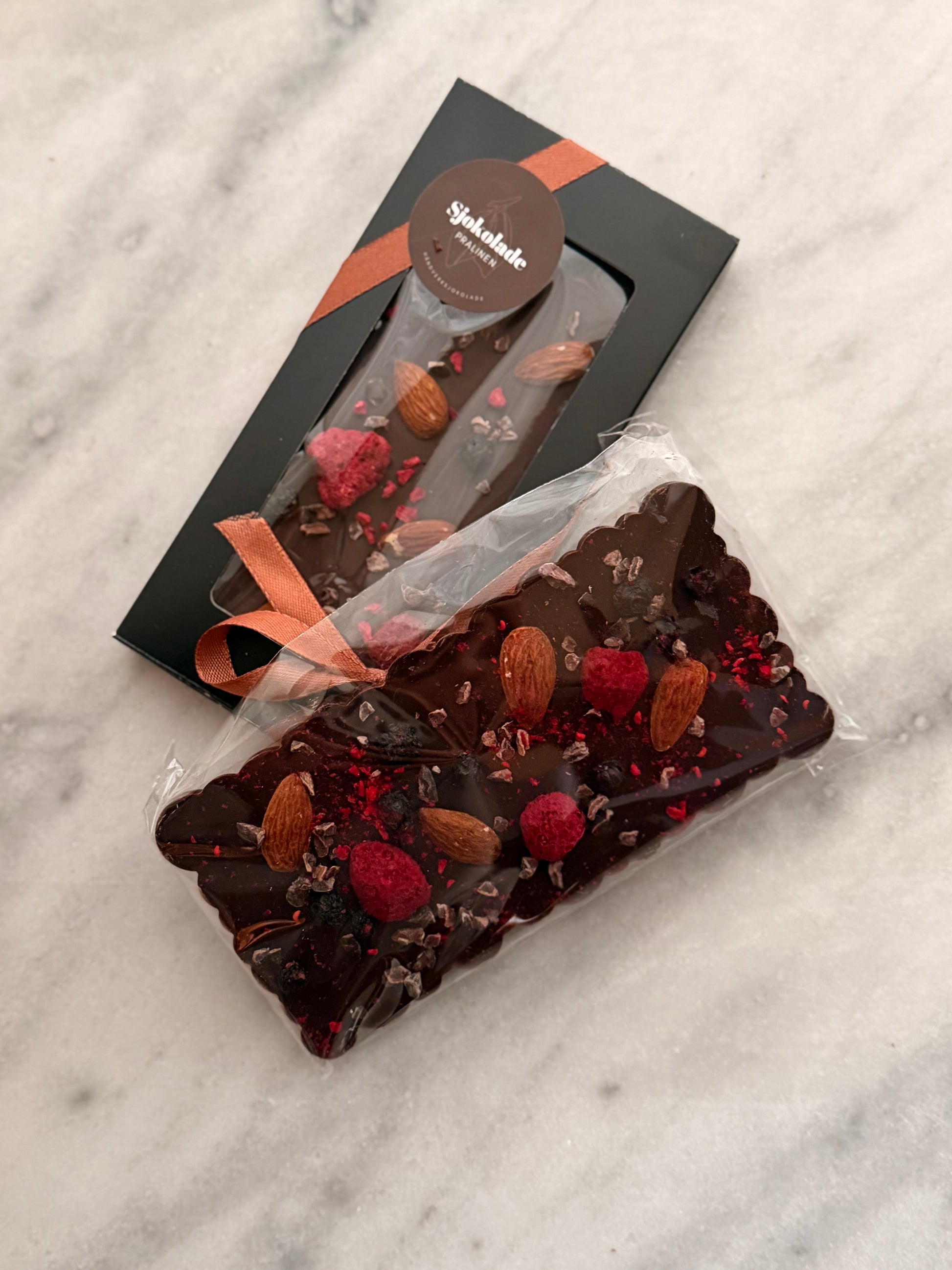 Mørk sjokolade med blåbær, bringebær & kakaonibs og mandler.