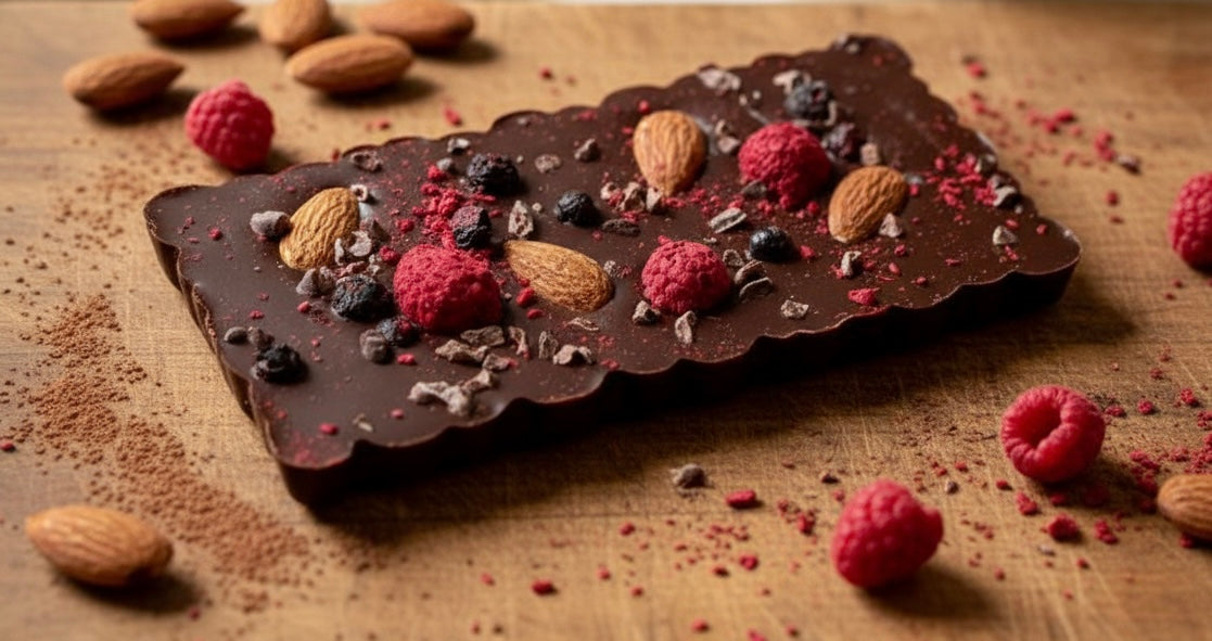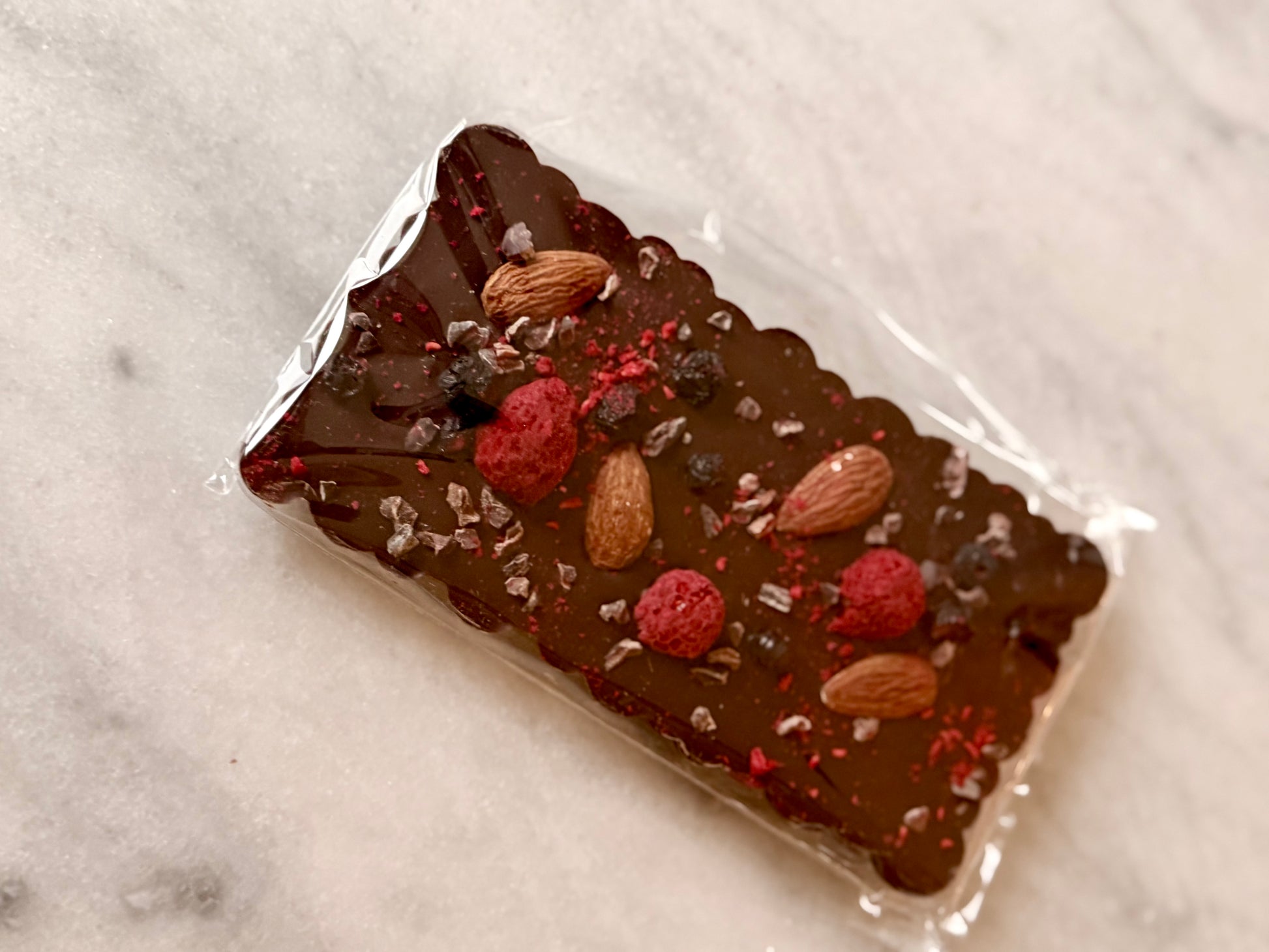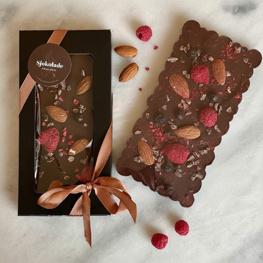 Mørk sjokolade med blåbær, bringebær & kakaonibs og mandler.