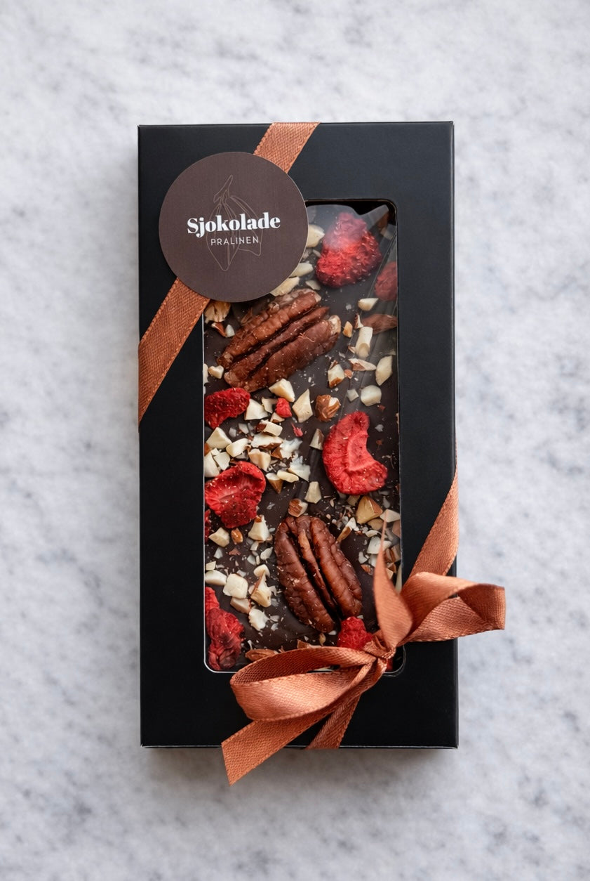 Mørk sjokolade med pekannøtter, hasselnøtt & jordbær samt bringebær strø.