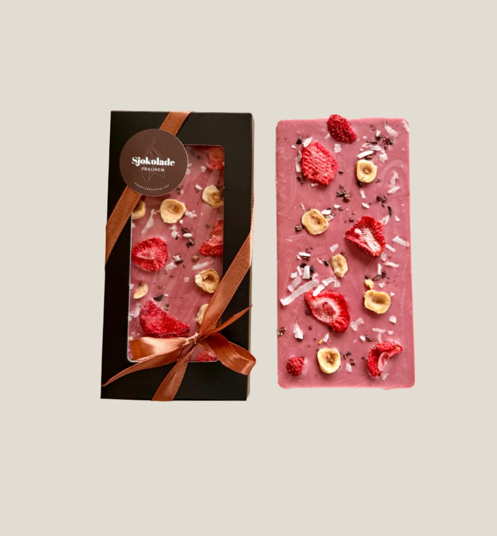 Ingredienser: Ruby sjokolade (kakaomasse, sukker, kakaosmør, skummetmelkpulver, helmelkpulver, emulgator (soyalecitin), sitronsyre, naturlig vanilje), frysetørket jordbær, hasselnøtter, kokosflak, kakaonibs (nicaraguansk kakao).