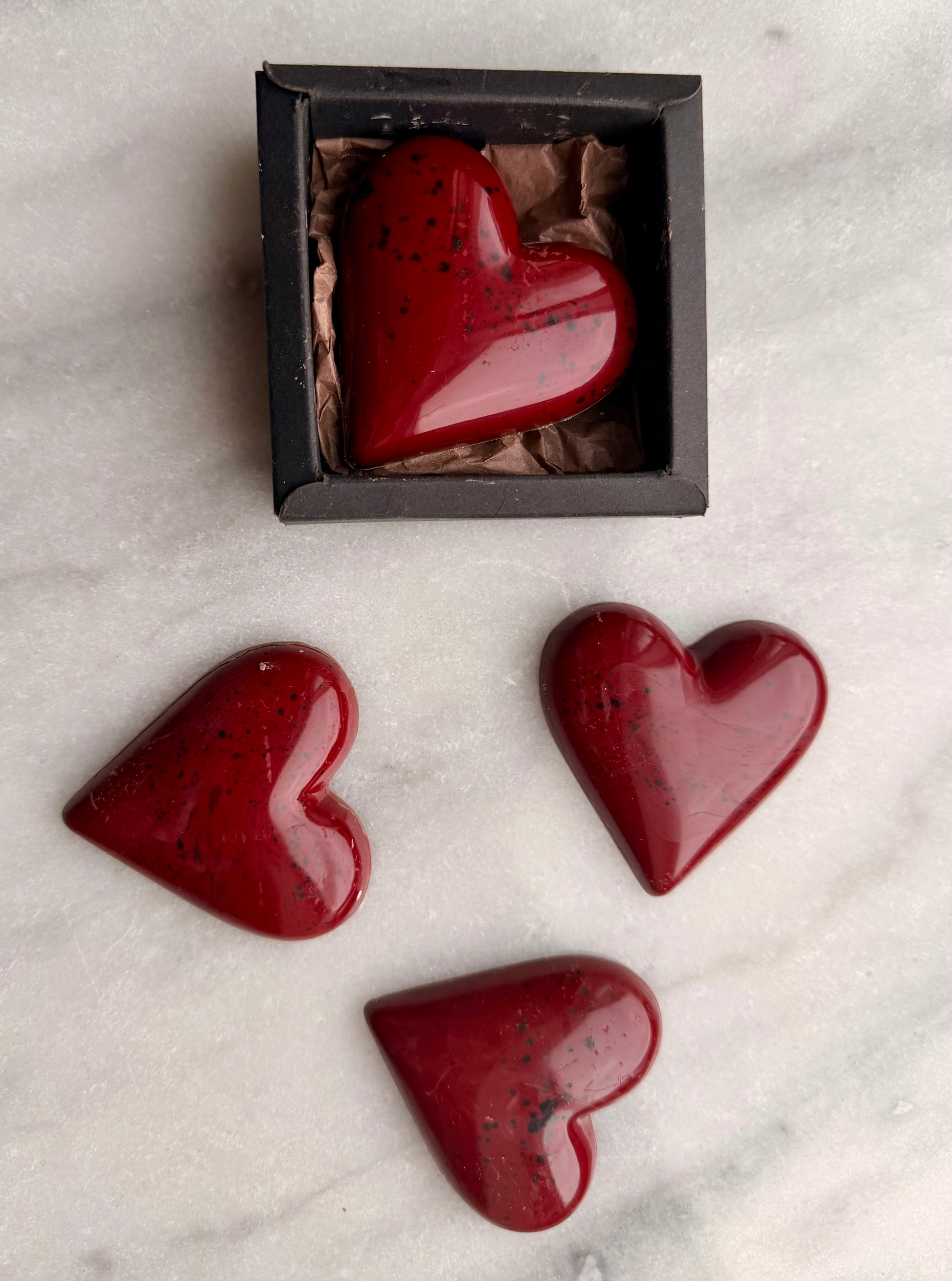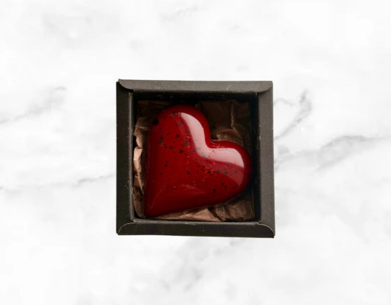 Et håndlaget sjokoladehjerte fylt med silkemykt salt lakrisfyll laget på hvit sjokolade, omsluttet av kremet melkesjokolade. En intens og elegant kombinasjon av sødme og markant salt lakris – perfekt for lakriselskeren eller som en liten, luksuriøs gave.